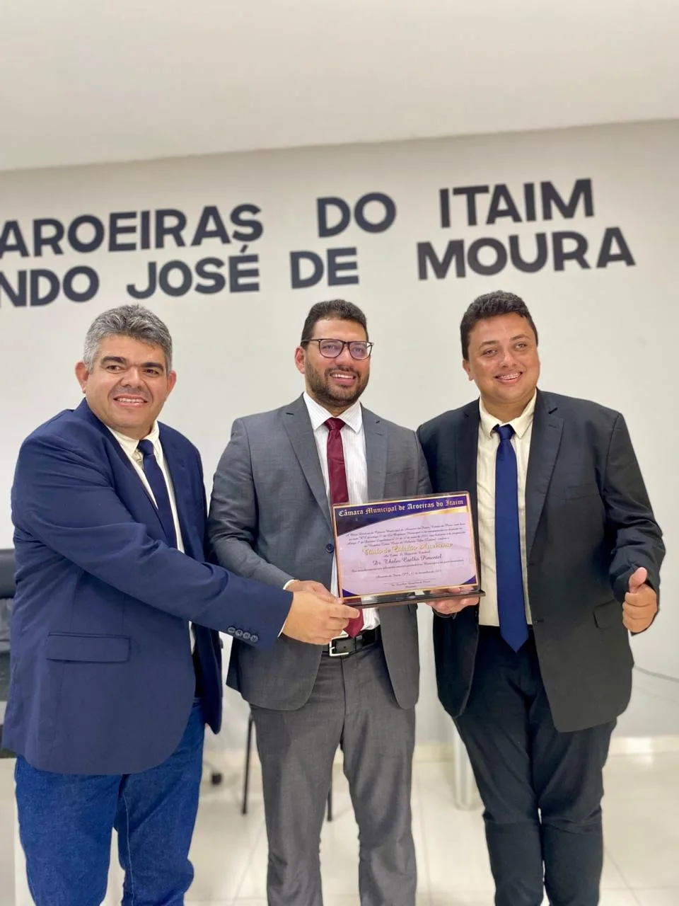 “É uma alegria muito grande para Aroeiras do Itaim receber oficialmente essas pessoas que já contribuem com o nosso município. A contribuição é imensa e muito diversa. O Dr. Thales tem sido um grande parceiro da nossa gestão, trazendo recursos essenciais para obras de infraestrutura, saúde e melhorias que chegam diretamente à população. O Leonardo é um servidor exemplar, dedicado à saúde e presente no dia a dia da comunidade, sempre disposto a ajudar e apoiar ações sociais e culturais. E o pastor Vicente, ao longo de dez anos, tem sido um líder espiritual que se tornou parte da vida das famílias aroeirenses, desenvolvendo um trabalho de fé, acolhimento e união. Cada um deles, à sua maneira, fortalece o nosso município”, disse.