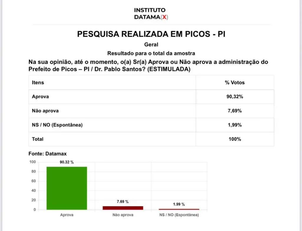 Próximo de completar apenas seu oitavo mês, a administração “Reconstruindo o Nosso Futuro”, do prefeito de Picos, Dr. Pablo Santos (MDB), atingiu um índice de aprovação bastante satisfatório: 90,32%.
