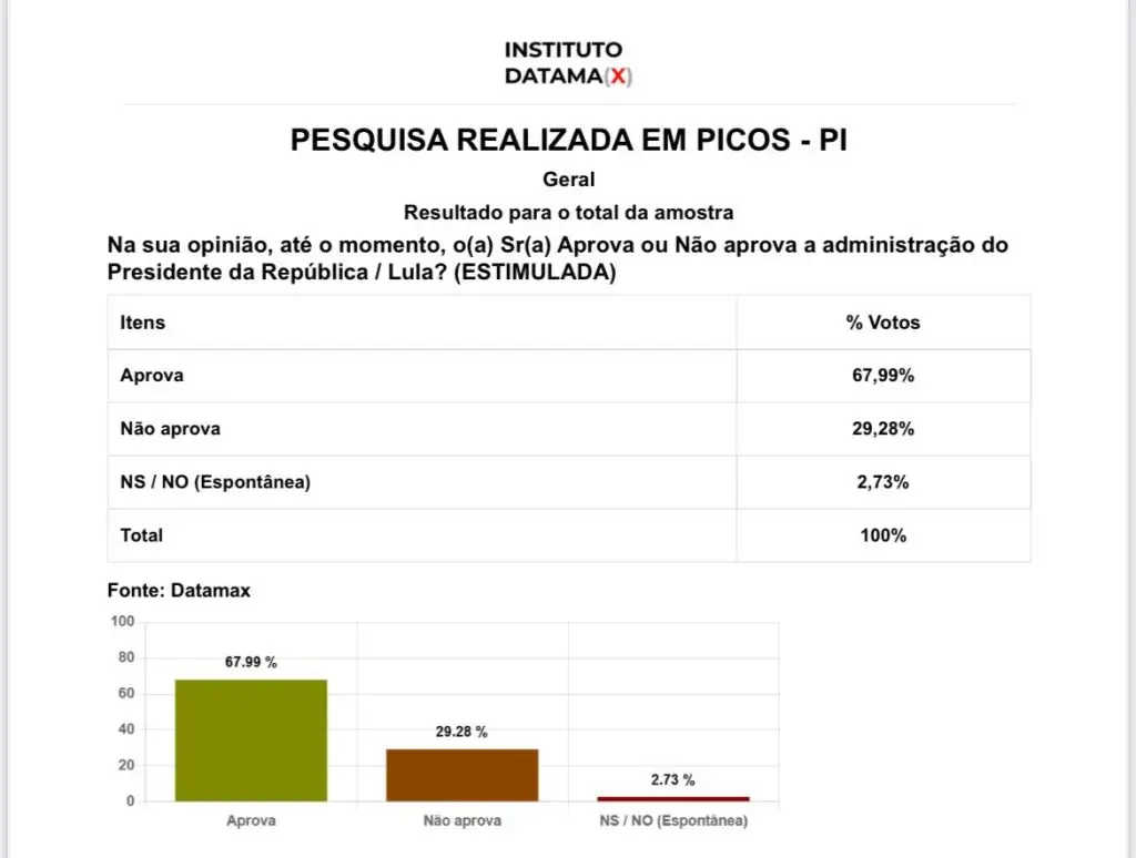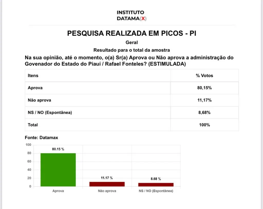 Já a aprovação do Governador do Estado do Piauí, Rafael Fonteles (PT), em Picos, conforme esse levantamento do Datamax, foi de 80,15%, contra uma desaprovação de 11,17% e u percentual de 8,68% dos entrevistados que não sabiam ou não quiseram responder a pesquisa.