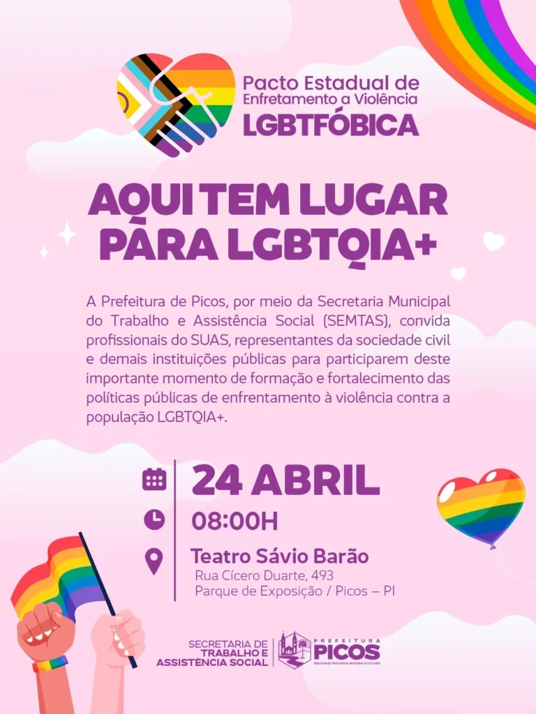 A Prefeitura de Picos, por meio da Secretaria Municipal do Trabalho e Assistência Social (SEMTAS), promoverá no dia 24 de abril, às 8h, no Teatro Sávio Barão, a formação “Aqui Tem Lugar para LGBTQIA+”, atividade que integra o processo de adesão ao Pacto Estadual de Enfrentamento à Violência LGBTfóbica.
