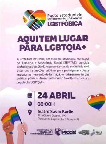 Com o lema: “Aqui tem lugar para LGBTQIA+”, o município picoense sediará um importante momento de formação e fortalecimento das políticas públicas voltadas para a proteção desse público.