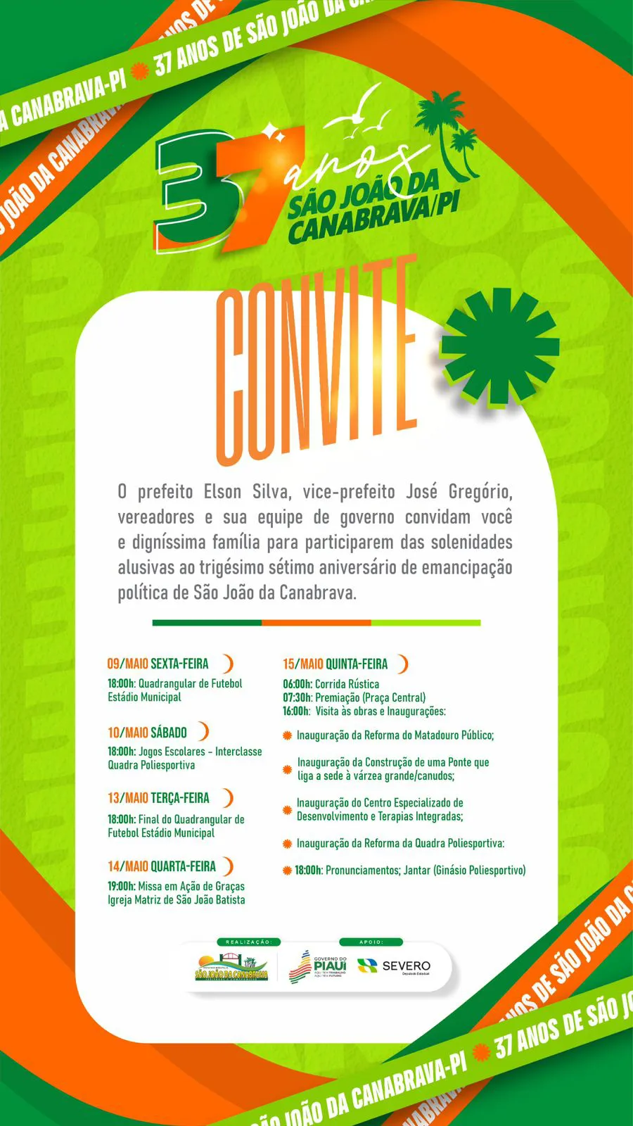 O município de São João da Canabrava, no Piauí, celebra seus 37 anos de emancipação política com uma programação diversificada organizada pela Prefeitura Municipal, com apoio do Governo do Estado e da Severo Construções. As atividades acontecerão entre os dias 9 e 15 de maio, contemplando esporte, fé, cultura e inaugurações de obras importantes para a cidade.