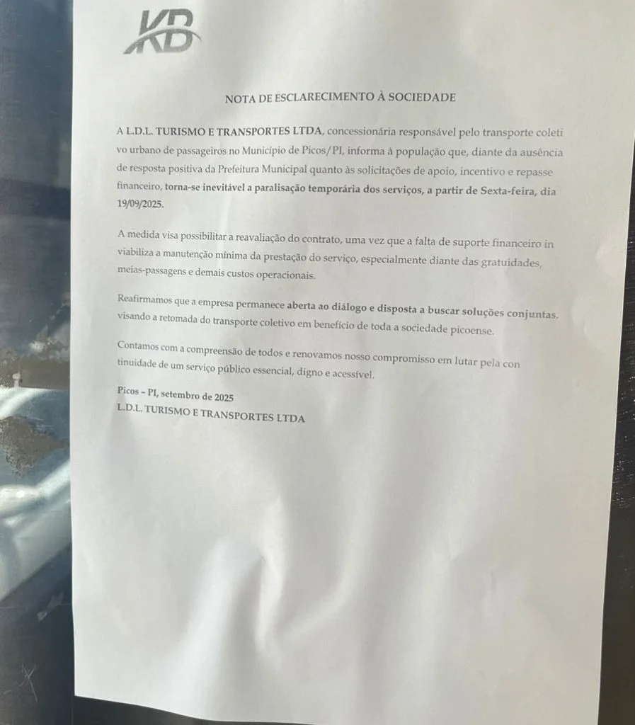 A direção do Campus Professor Barros Araújo da Universidade Estadual do Piauí (UESPI) em Picos anunciou a suspensão das atividades presenciais a partir do dia 19 de setembro de 2025. A medida foi adotada em razão da paralisação, sem prazo para retorno, dos serviços de transporte coletivo urbano operados pela empresa L.D.L Turismo e Transportes LTDA (KB Transportes).