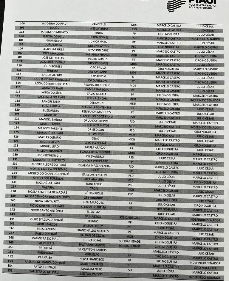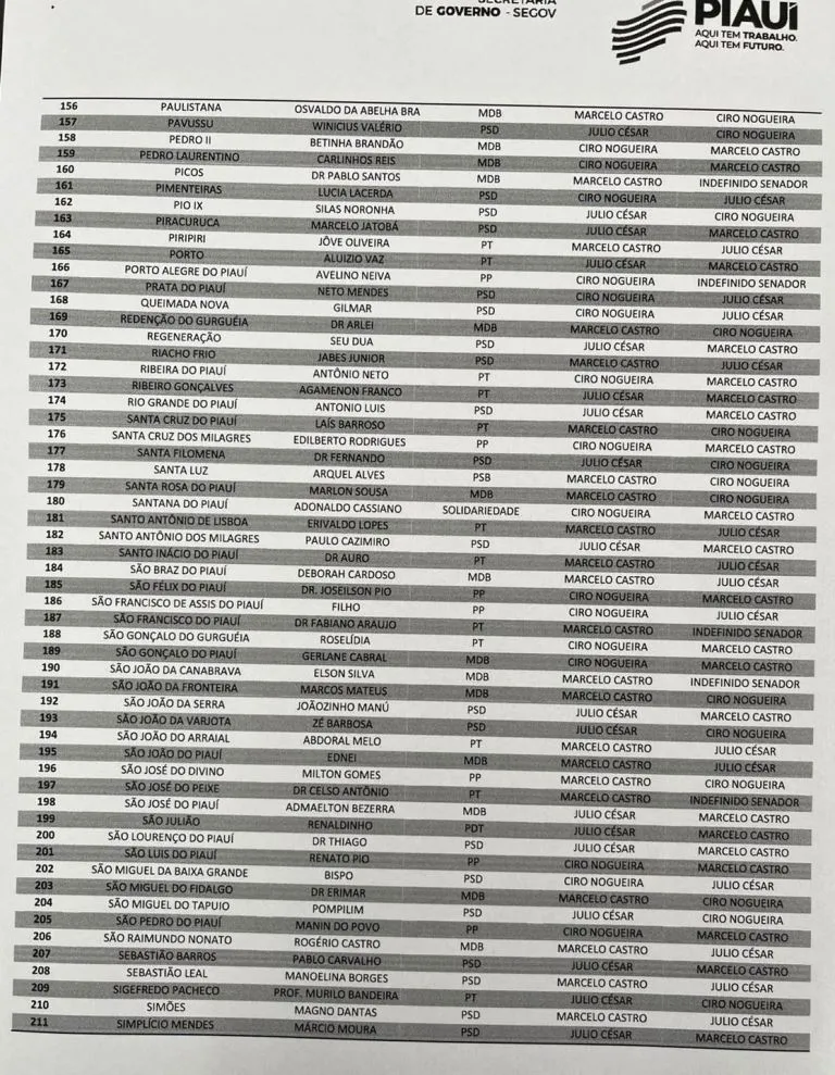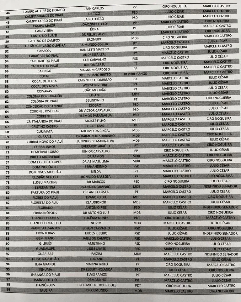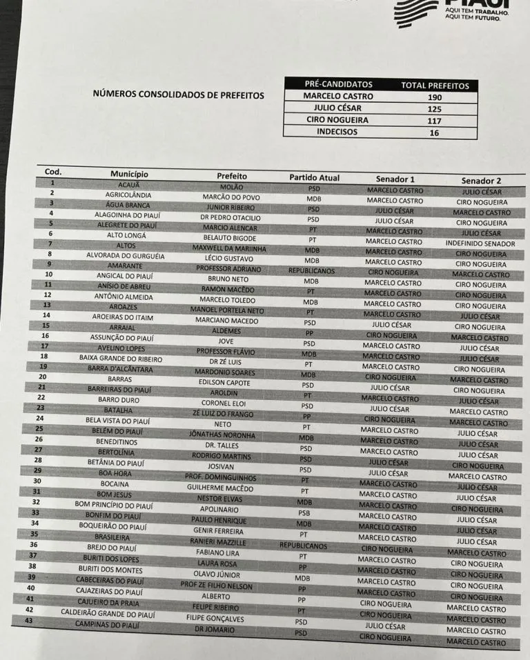 De acordo com a lista, o senador Marcelo Castro (MDB) lidera com folga, contando com o apoio declarado de 190 prefeitos. Na sequência aparece o deputado federal Júlio César (PSD), que deve receber apoio de 125 gestores municipais. O terceiro colocado é o também senador Ciro Nogueira (PP), com 117 prefeitos alinhados.